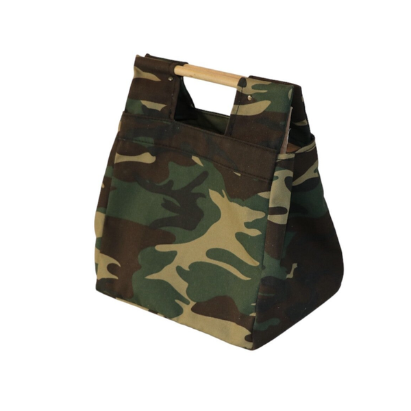 Handtas van dikke camouflage stof met keuze tussen beukenhouten of bamboe handvaten.
